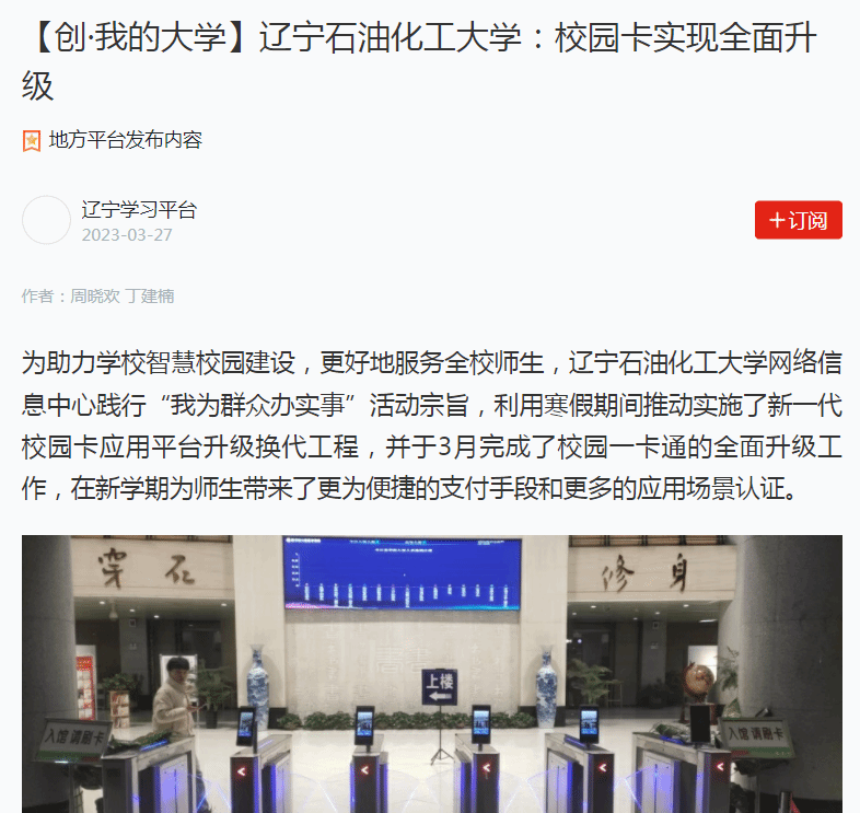 编者按:近日,学习强国辽宁学习平台、人民日报客户端·人民号、辽宁日报·北国号等媒体平台对我校网络信息中心践行“我为群众办实事”活动宗旨,利用寒假期间推动实施了新一代校园卡应用平台升级换代工程,并于3月完成了校园一卡通的全面升级工作,在新学期为师生带来了更为便捷的支付手段和更多的应用场景认证进行了宣传报道。现将相关报道转载如下:
