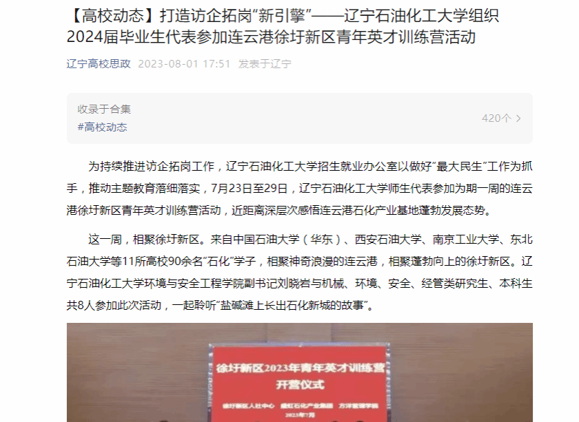 编者按:近日,辽宁高校思政微信公众号对我校招生就业办公室以做好“最大民生”工作为抓手,推动主题教育落细落实,组织环境与安全工程学院副书记刘晓岩与机械、环境、安全、经管类研究生、本科生共8人代表参加为期一周的连云港徐圩新区青年英才训练营活动,近距离深层次感悟连云港石化产业基地蓬勃发展态势进行了宣传。现将相关报道转载如下: