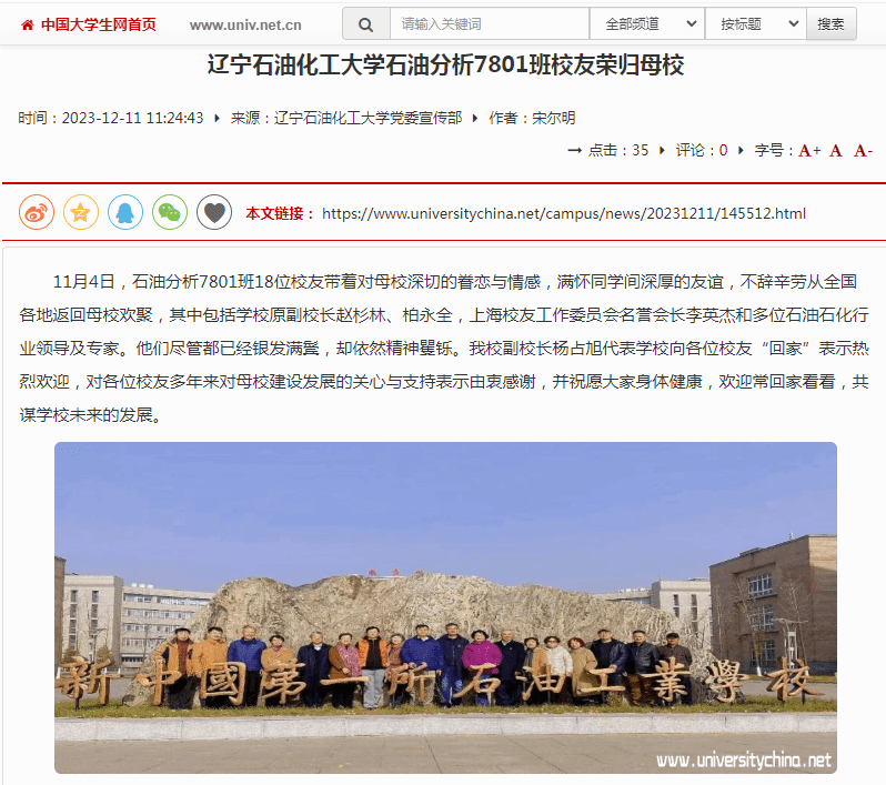 编者按:近日,石油分析7801班18位校友带着对母校深切的眷恋与情感,满怀同学间深厚的友谊,不辞辛劳从全国各地返回母校欢聚。中国大学生网、辽宁日报·辽望号、人民日报客户端·人民号对此进行了宣传报道。现将相关报道转载如下: