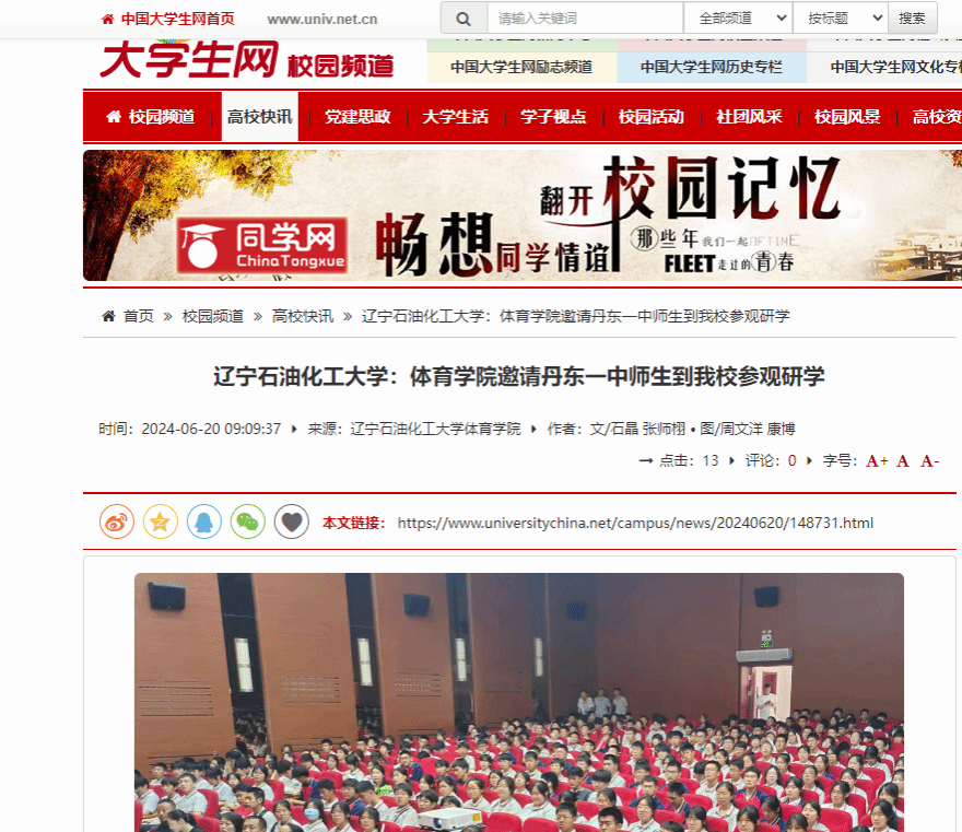 编者按:近日,中国大学生网对我校体育学院邀请丹东一中高二师生近500人到我校参观研学活动进行了宣传报道。现将相关报道转载如下: