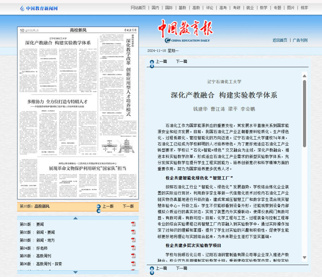 编者按:11月18日,中国教育报第10版高校新风和中国教育新闻网对我校校长钱建华等撰写的文章《深化产教融合 构建实验教学体系》进行了刊登报道。现将相关报道转载如下: