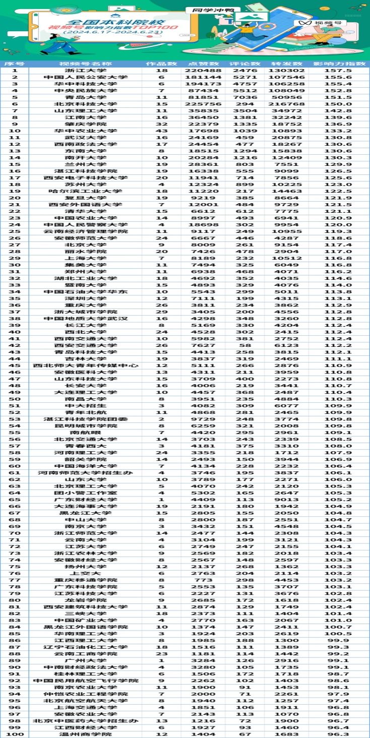 中青校媒微信公众号:全国高校(本科院校/职业院校)视频号影响力指数(2024.6.17-2024.6.23)-国产亚洲综合一区二区三区_亚洲欧美日韩中文天堂_尤物在线观看视频不卡无码_国产最新精品亚洲2025不卡_亚洲成Av人在线观看片水蜜桃